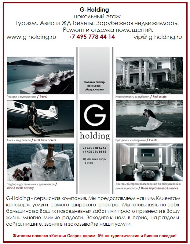 С апреля 2011 года для жителей коттеджного поселка «Княжье Озеро» введена бессрочная программа обслуживания, которая включает скидку -5% на туристические и бизнес поездки, а специальные условия по оказанию всего спектра услуг компании G-Holding.