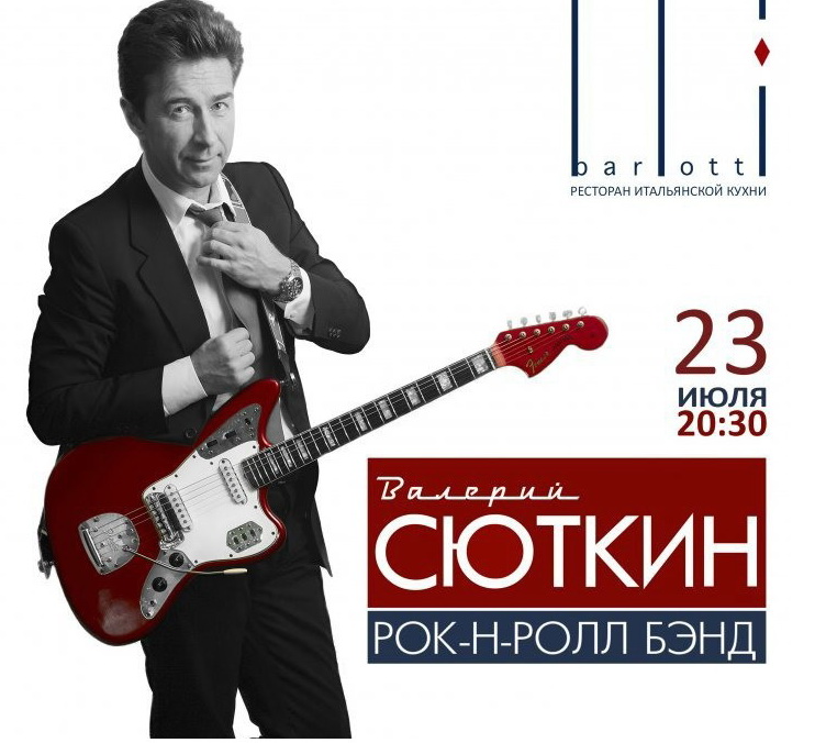23 июля в столице снова зазвучит знаменитый «Московский БИТ» — Валерий Сюткин и Рок&Ролл Бэнд представят нашумевшую программу для гостей ресторана высокой кухни Barlotti. «… Вас ждет веселье, легкость и естественность, потому как рок-н-ролл — это только живая музыка, без пластмассы…» — говорит Валерий Сюткин.